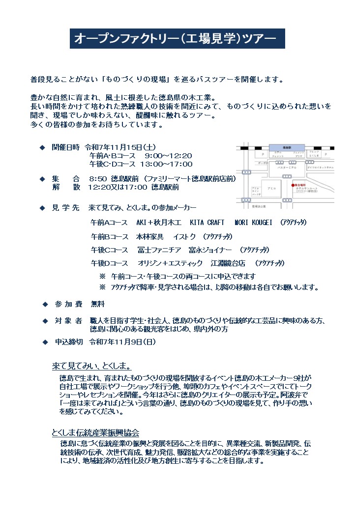 ※「来て見てみい、とくしま。」期間中、バスツアー以外にも各社はオープンファクトリーやワークショップを開催しています。詳しくはHPを御覧ください。また、インターンシップを希望される場合は協会にお問い合わせください。