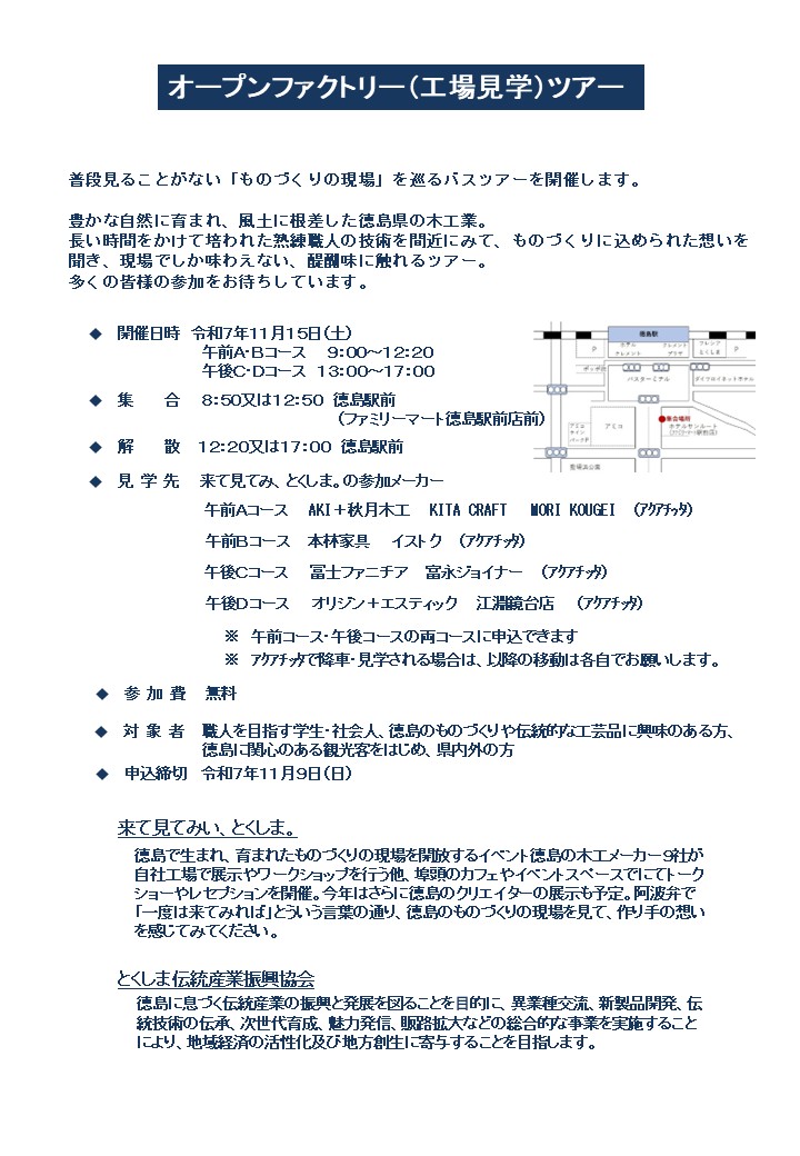 ※「来て見てみい、とくしま。」期間中、バスツアー以外にも各社はオープンファクトリーやワークショップを開催しています。詳しくはHPを御覧ください。また、インターンシップを希望される場合は協会にお問い合わせください。